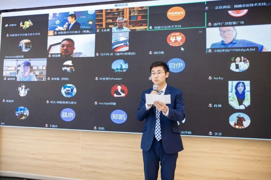 察哈尔学会中东办公室负责人金家毅现场宣读了第十三届全国政协外事委员会副主任、察哈尔学会会长韩方明博士对于此次选举大会的贺信和为阿联酋中华总商会的发展尽其所能的意愿。